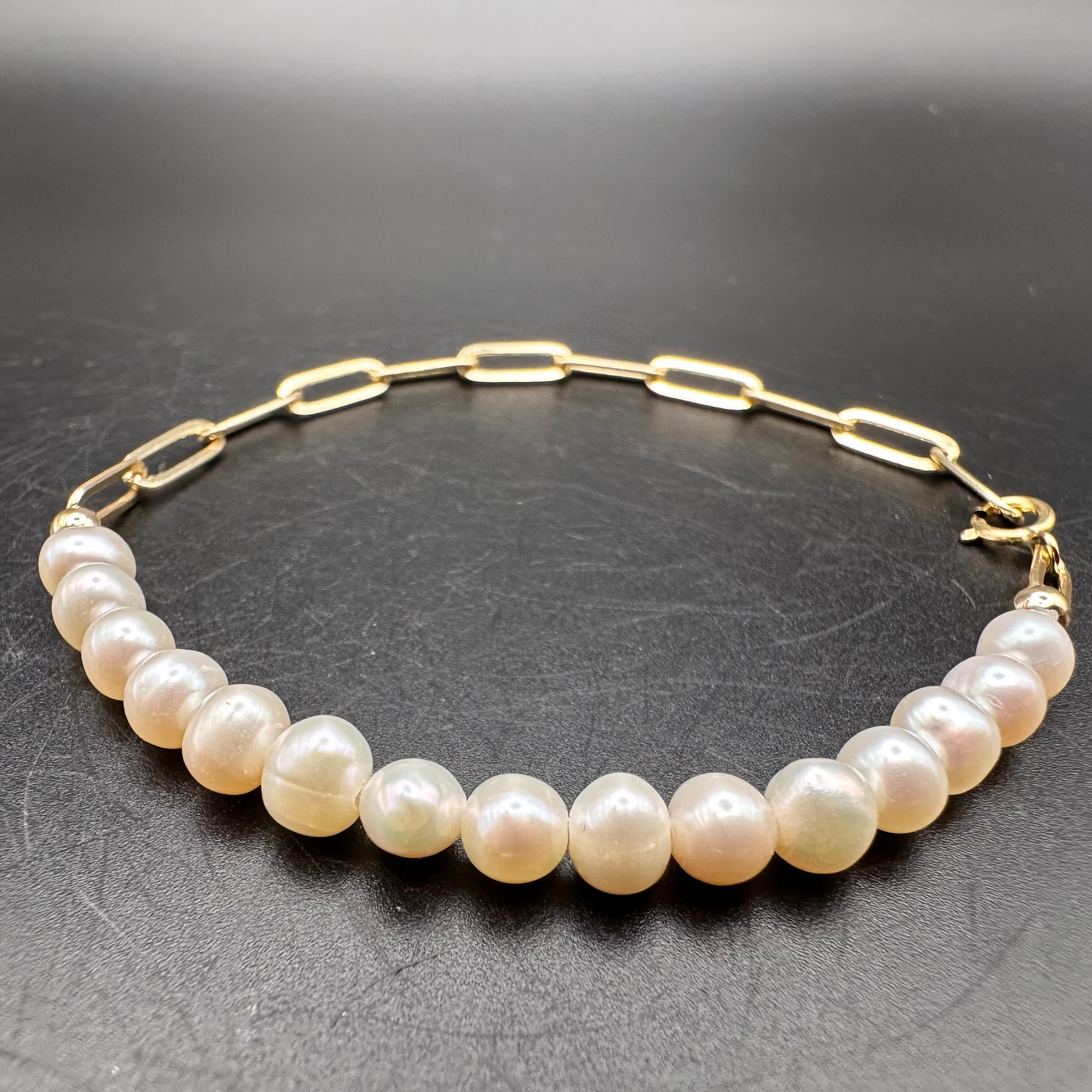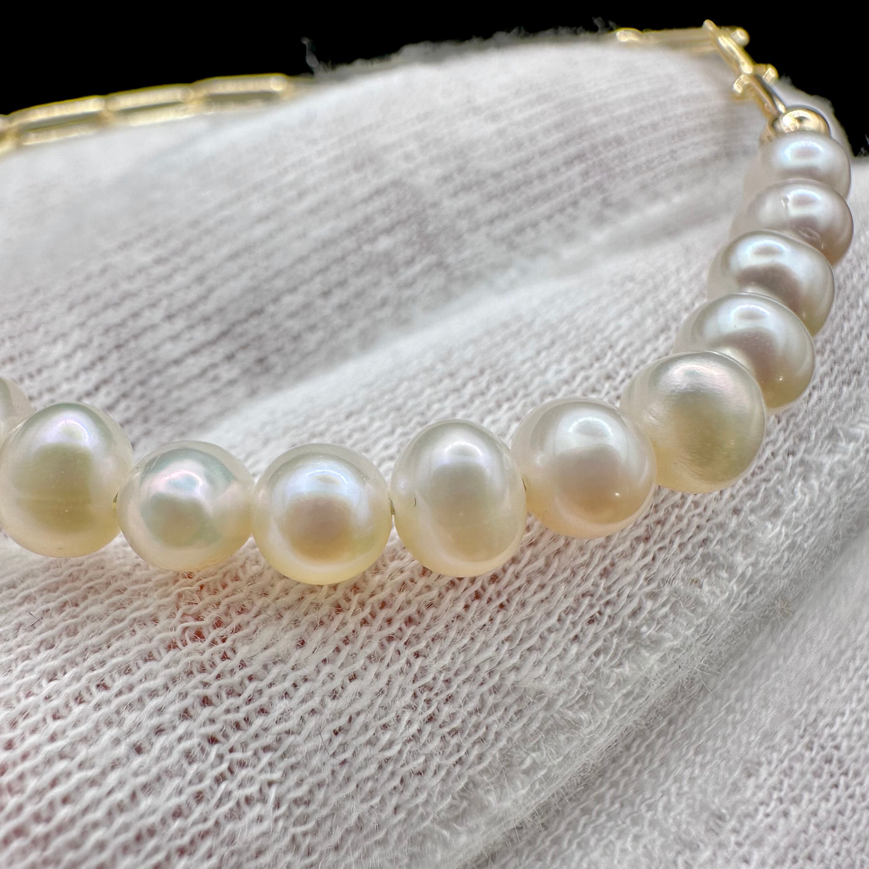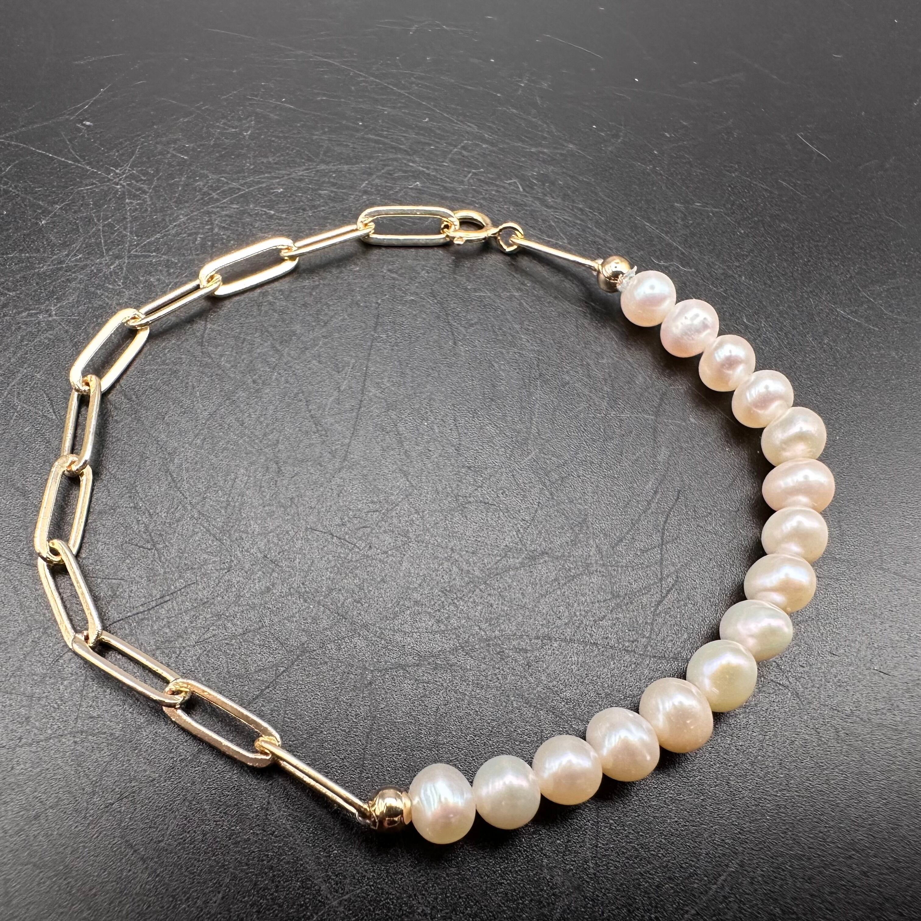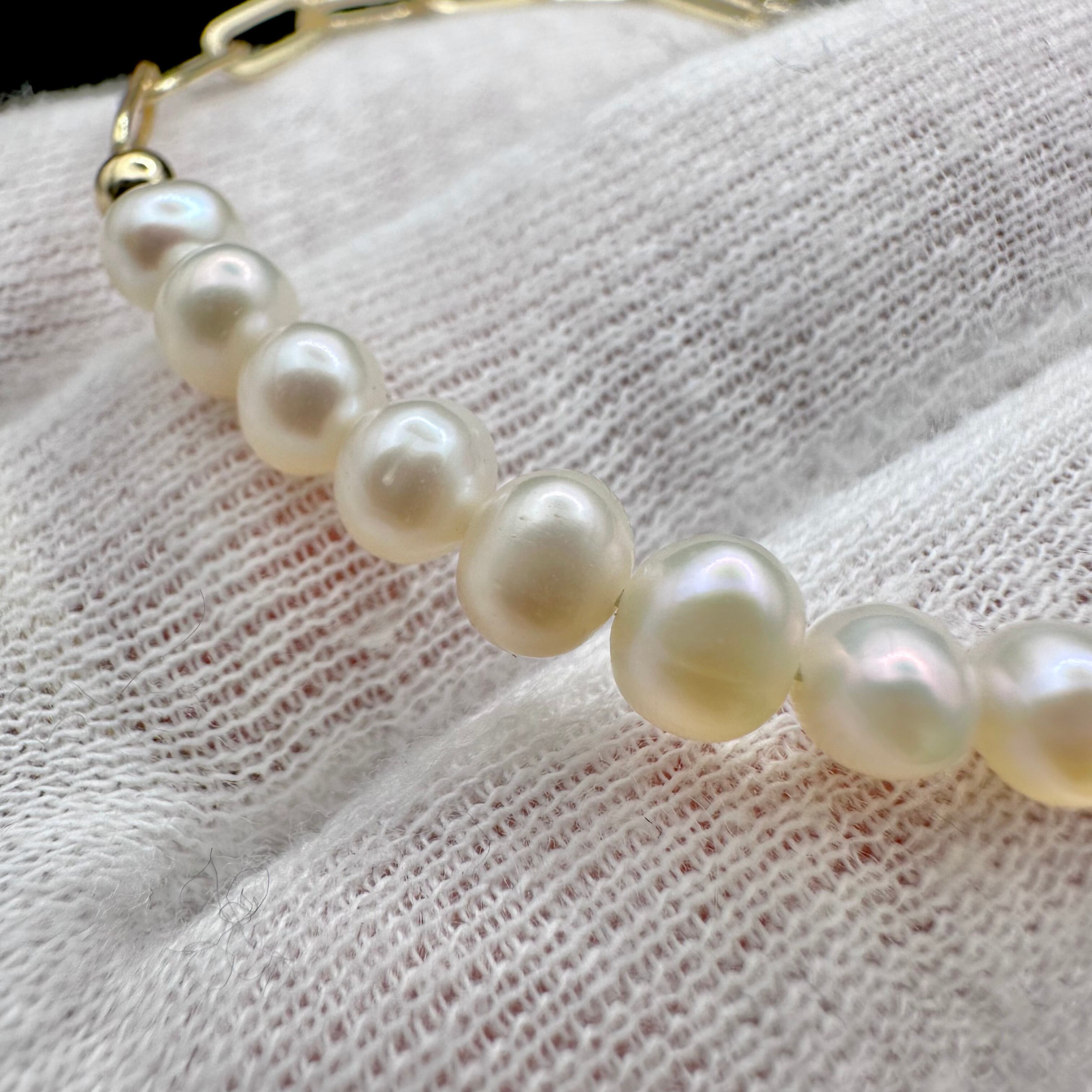 シルバー925のザックリとしたチェーンとツヤも真珠の輝きも可愛い淡水パールを組み合わせた、カジュアルにもフェミニンにも使えるオシャレなブレスレットです。