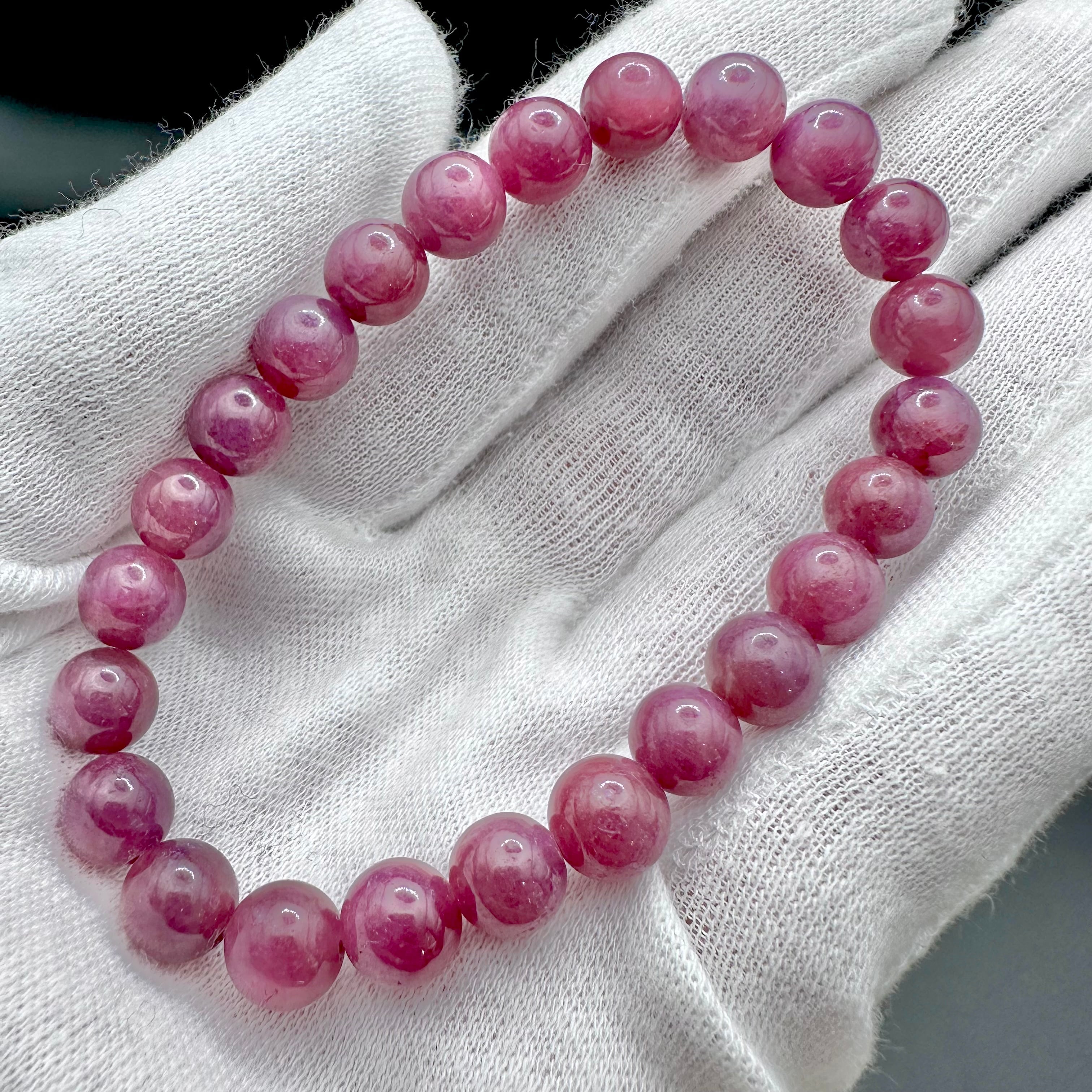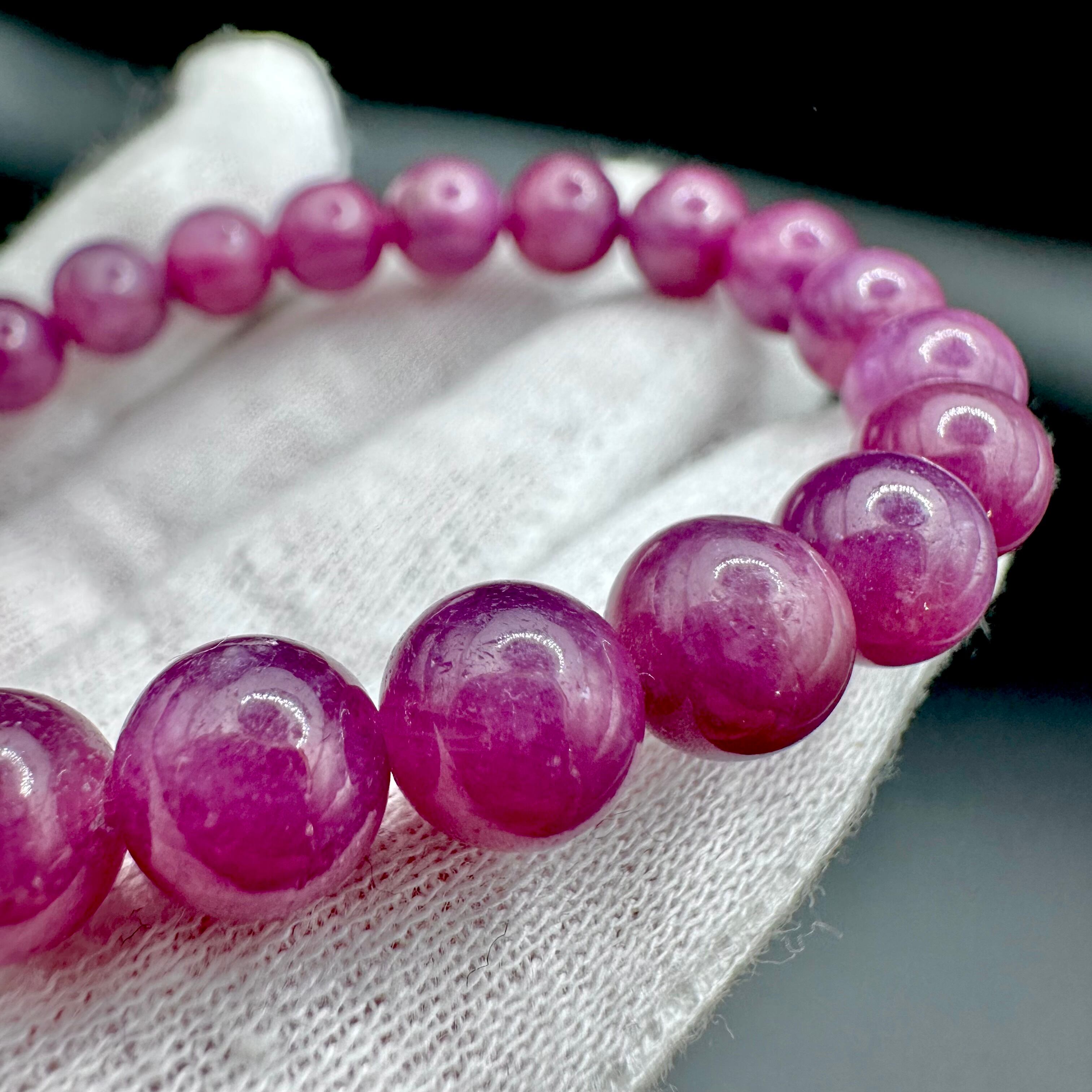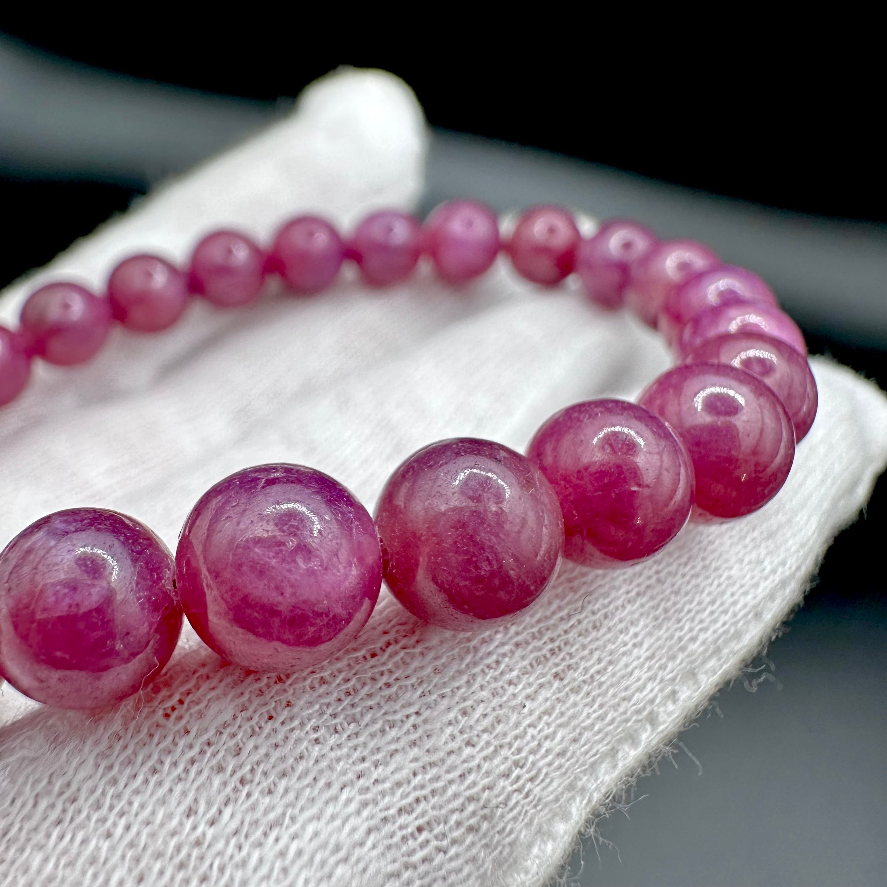 透明感は少し落ちるものの、発色がとても良くルビーとしては玉も大きいので存在感がしっかりとあるブレスレットです。