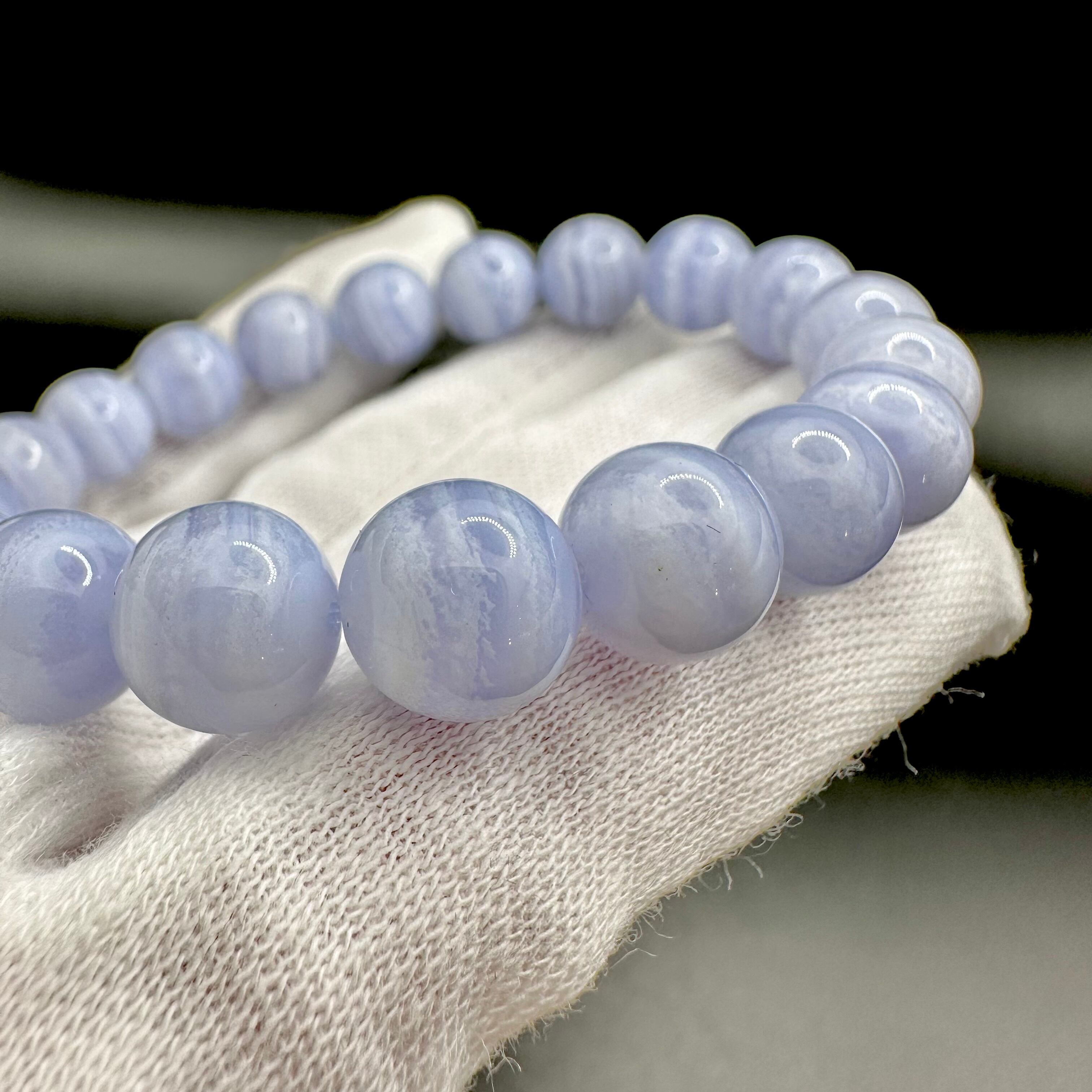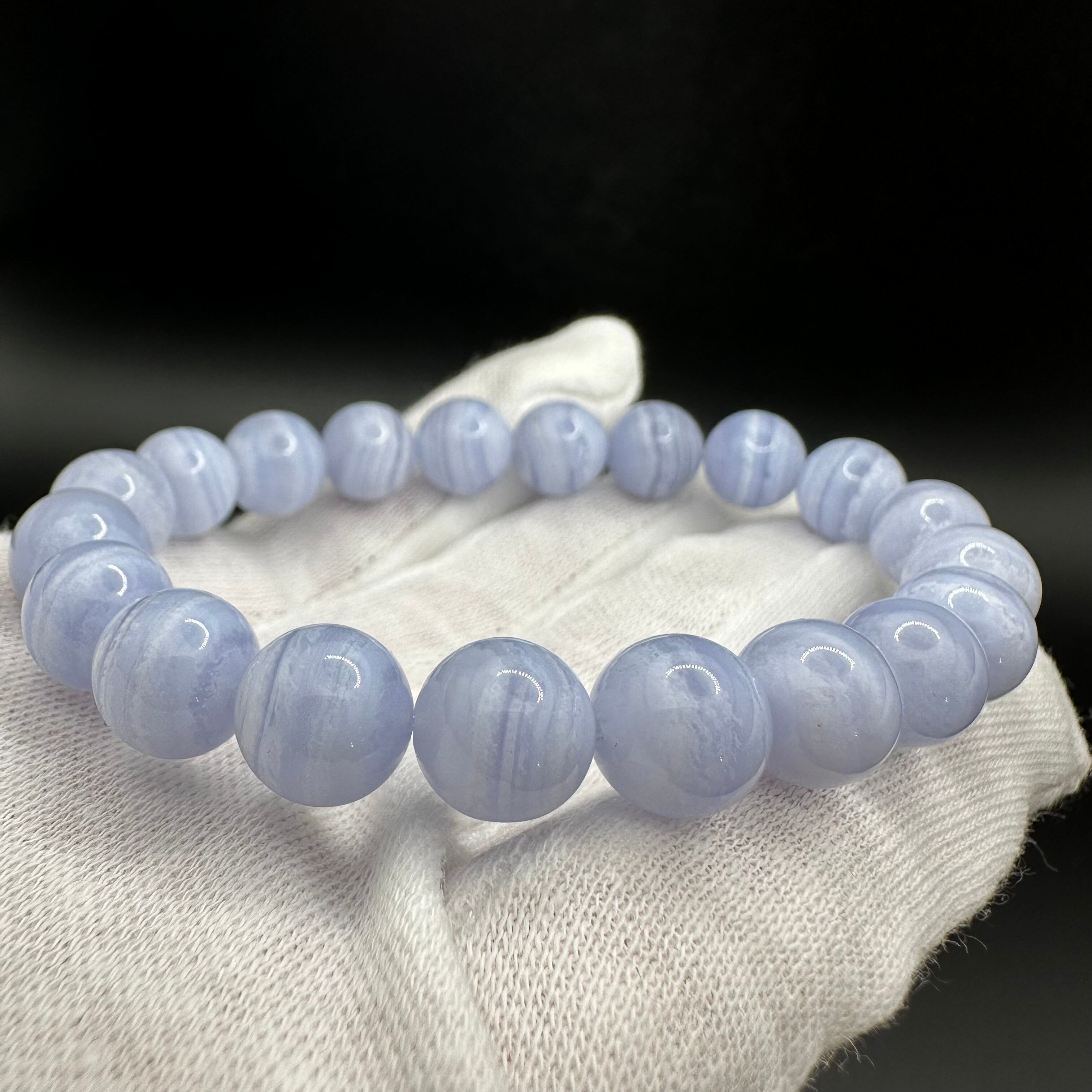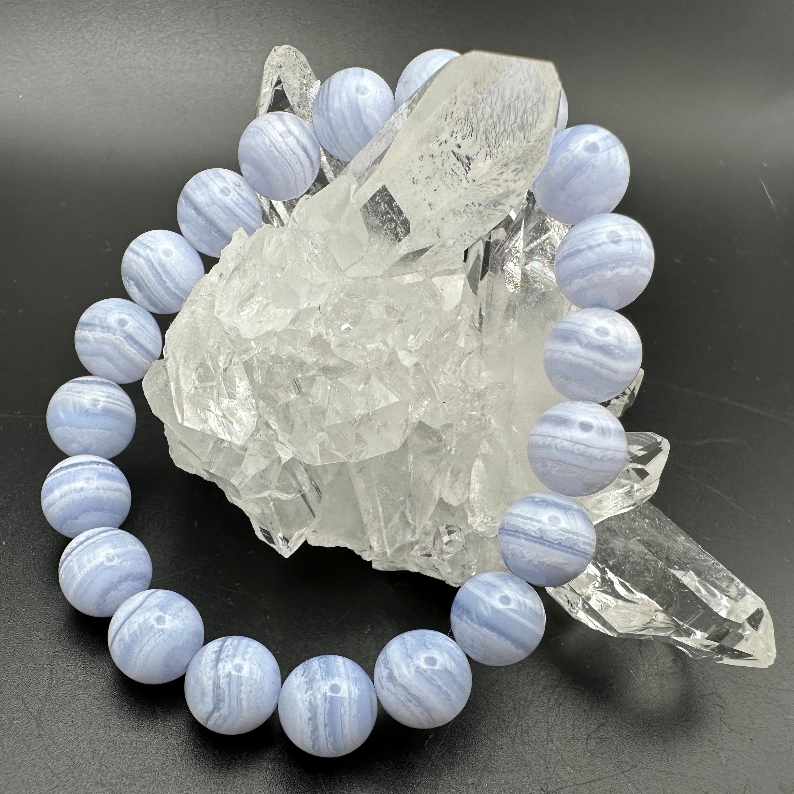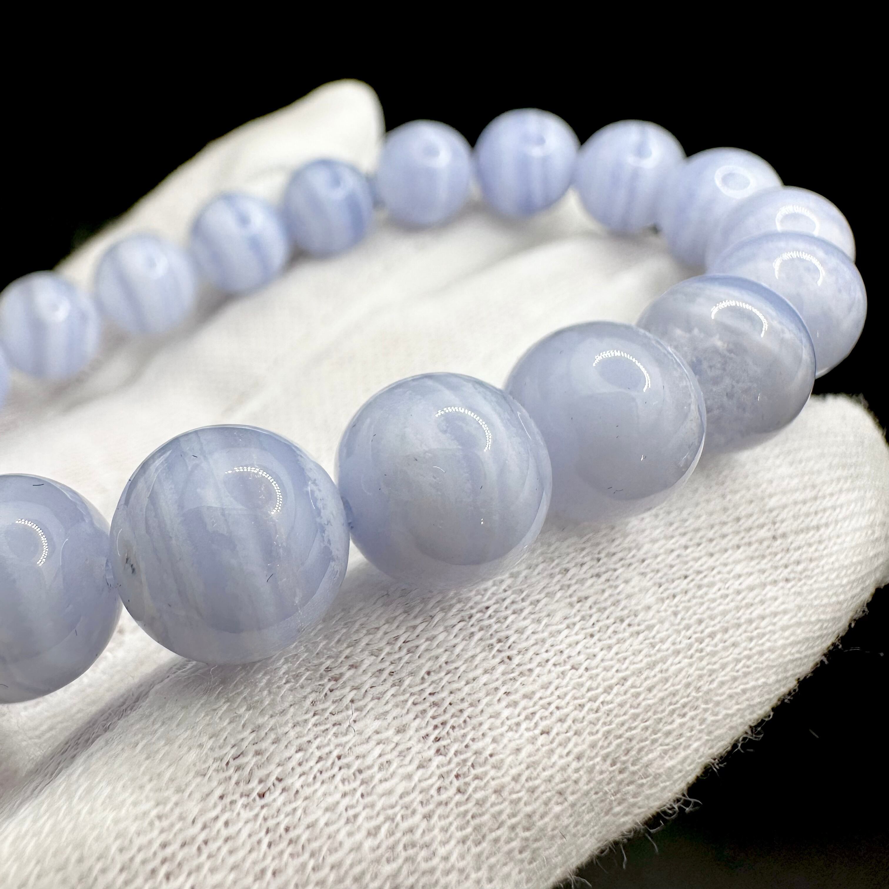 ブルーレースアゲートは、淡いブルーや白色が層状に重なって、表面に白い美しいレースのような模様が見られる石です。
